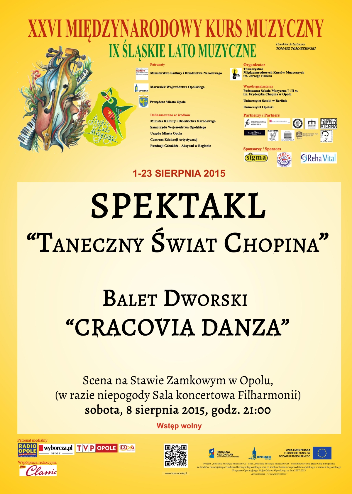 W sobotę, 08 sierpnia, na godzinę 21:00 zapraszamy na wyjątkowy spektakl „Taneczny świat Chopina”. Podczas spektaklu, który będzie niezwykle magicznym połączeniem tańca, muzyki i świateł, wystąpią artyści Baletu Dworskiego „Cracovia Danza” z Krakowa.